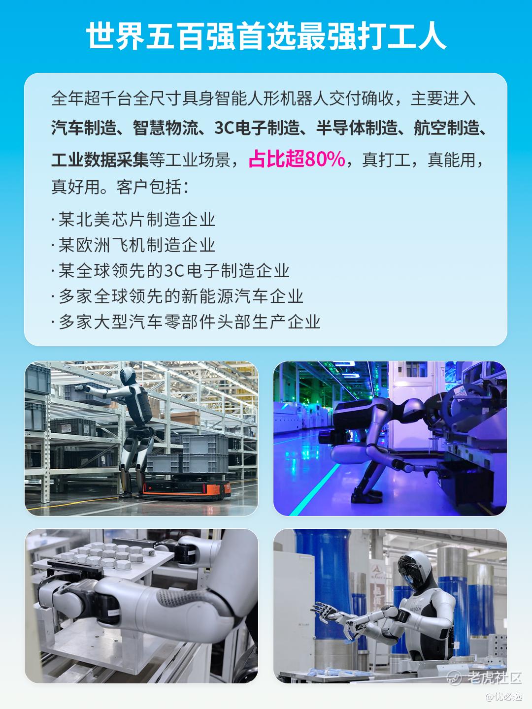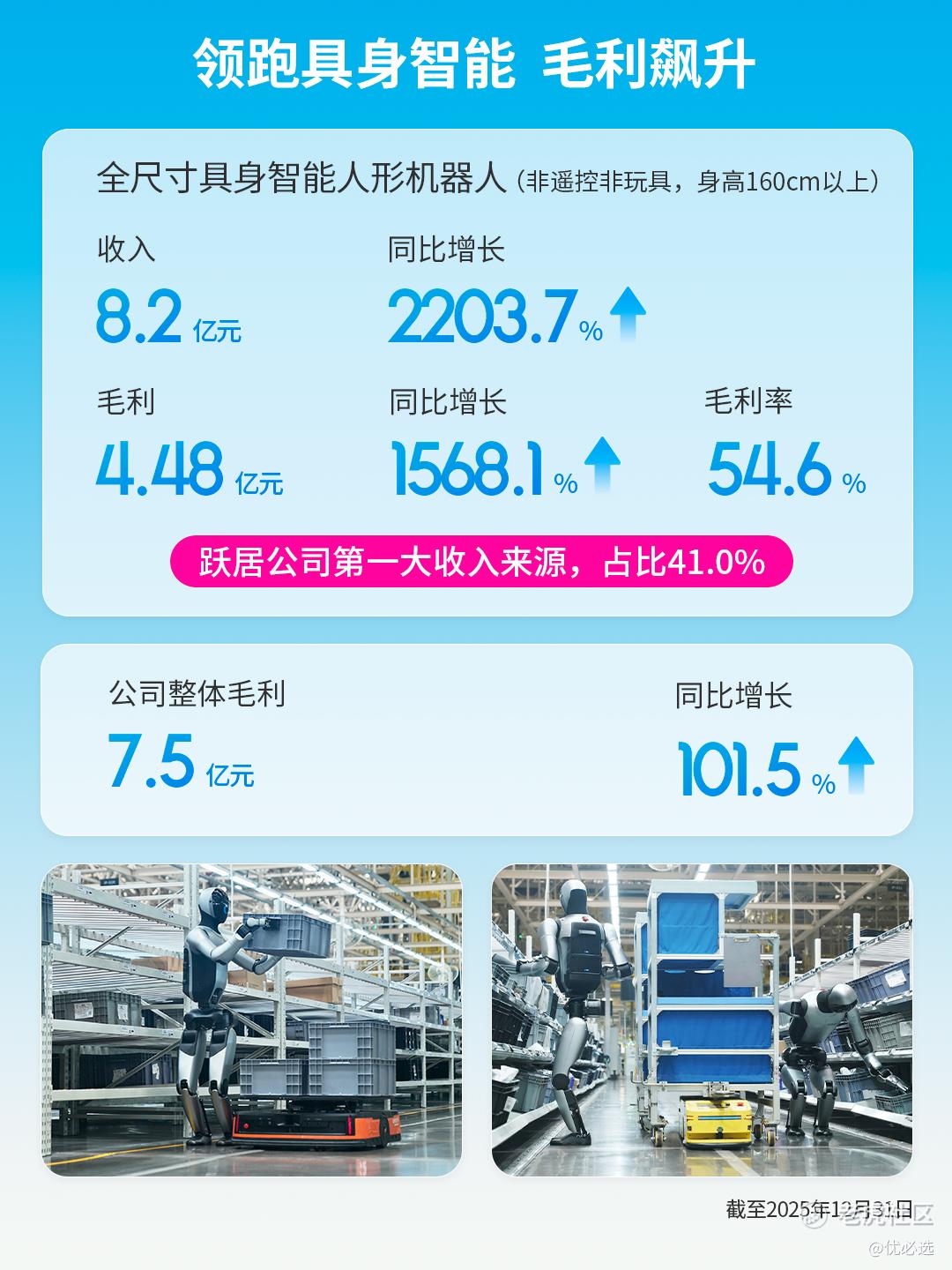 公司全年总营收达20.01亿元,同比增长53.3%,位居全球第一。全尺寸具身智能人形机器人(非遥控非玩具,身高160cm以上)成为公司第一大收入来源,收入飙升,达8.2亿元,同比增长2203.7%;销量达1079台,同比增长35866.7%;毛利4.48亿,同比增长1568.1%;工业场景销量超过80%。非全尺寸非具身智能人形机器人(含遥控、预编程及玩具,身高160cm以下)销量12759台,亦位居全球第一。