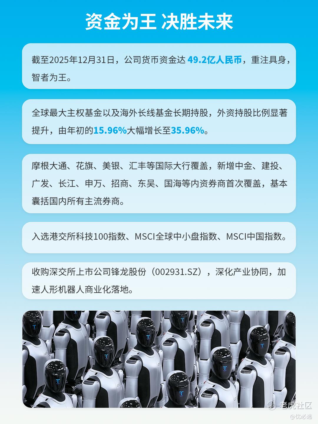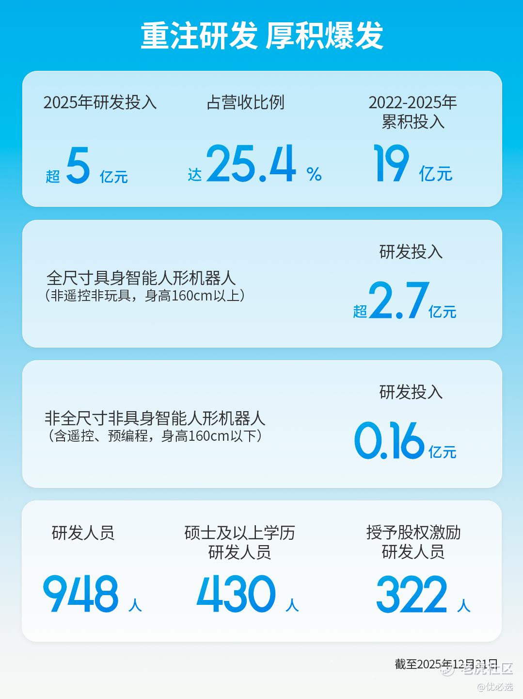 公司研发投入超5亿元,占营收比例达25.4%,其中全尺寸具身智能人形机器人研发投入超2.7亿元。近四年优必选累计研发投入已达19亿元。优必选还披露公司货币资金达 49.2亿人民币,将主要投入具身智能。