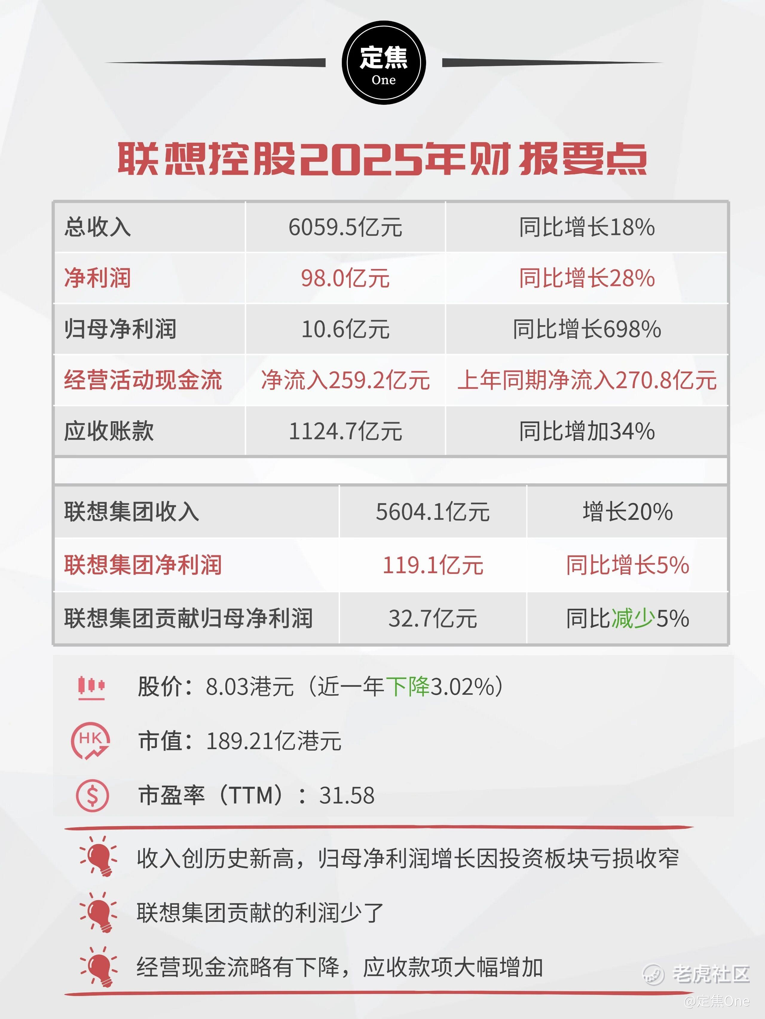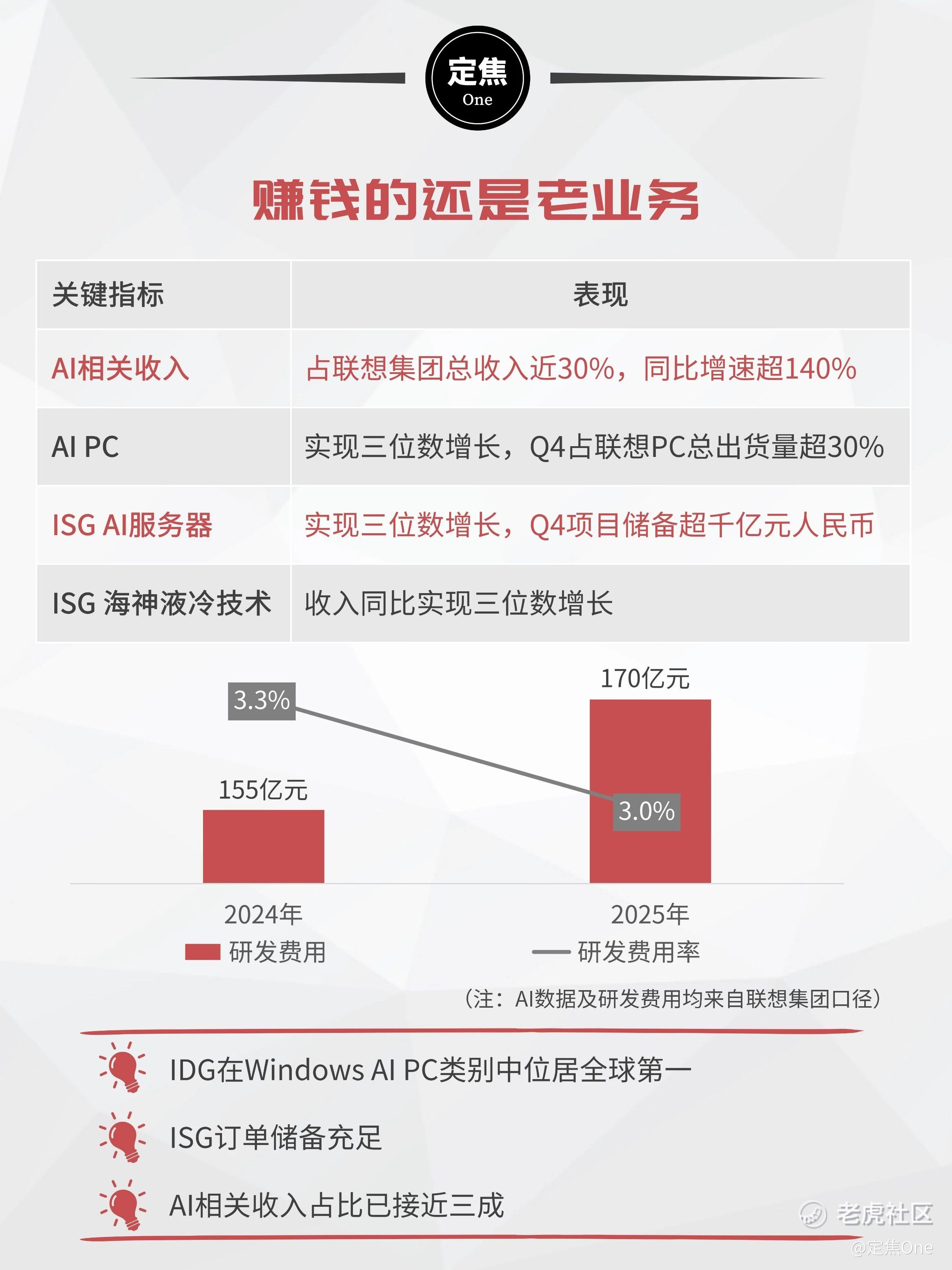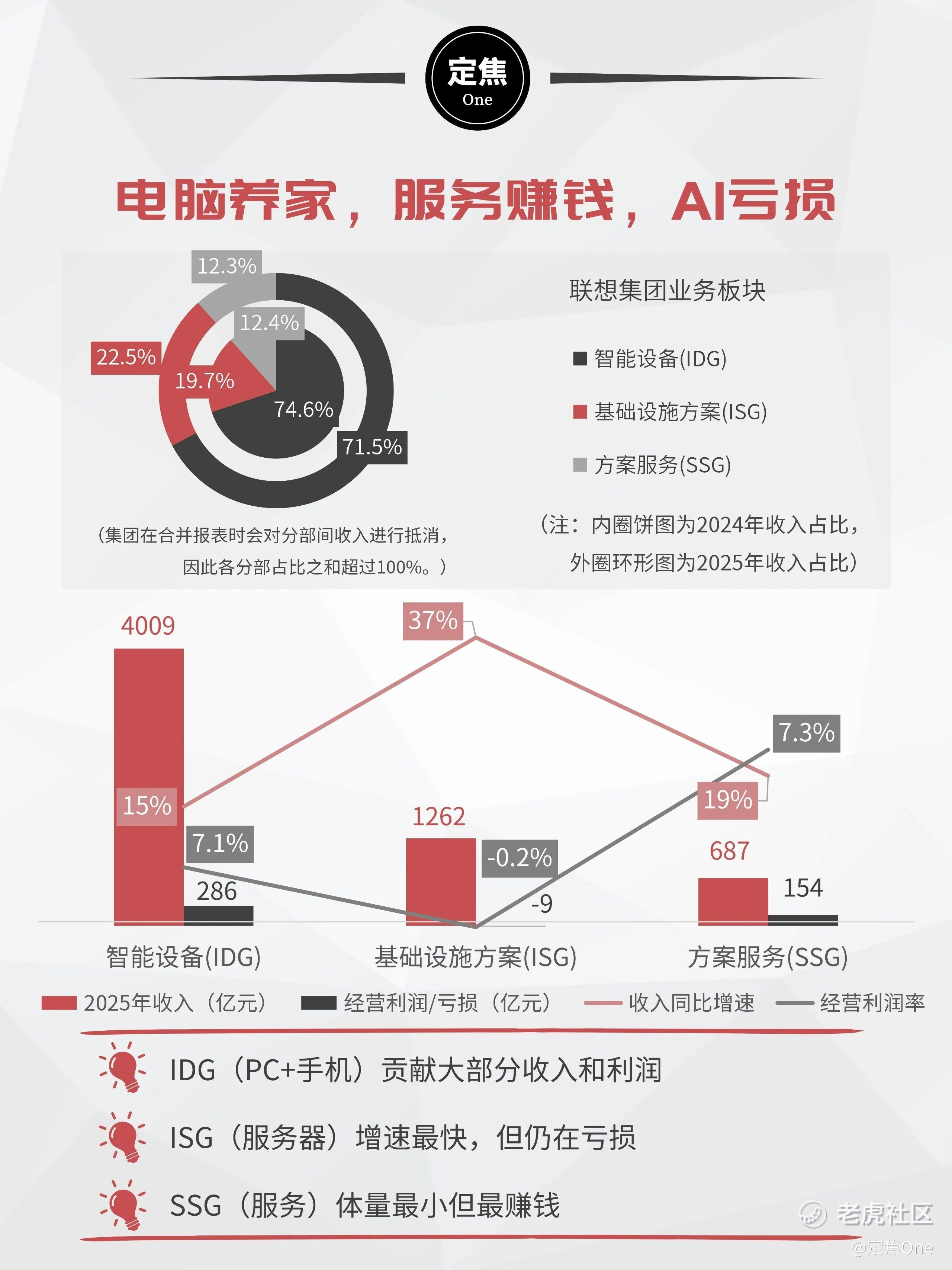 整体来看,联想集团的PC基本盘创下新高,服务业务的盈利能力继续提高,AI业务吃到了算力基础设施的红利,AI相关收入在总收入中的占比已接近三成。但联想控股层面,主业盈利能力没有太大改善,农业板块亏损,投资板块的账面改善取决于资本市场环境。