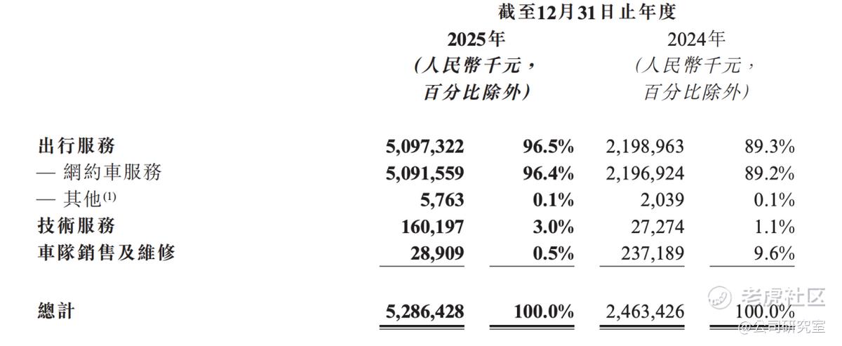 2025年,车队销售及维修业务因车辆销售收入减少出现大幅下滑,收入2891万元,同比下降87.8%,占比由上年的9.6%降至0.5%。