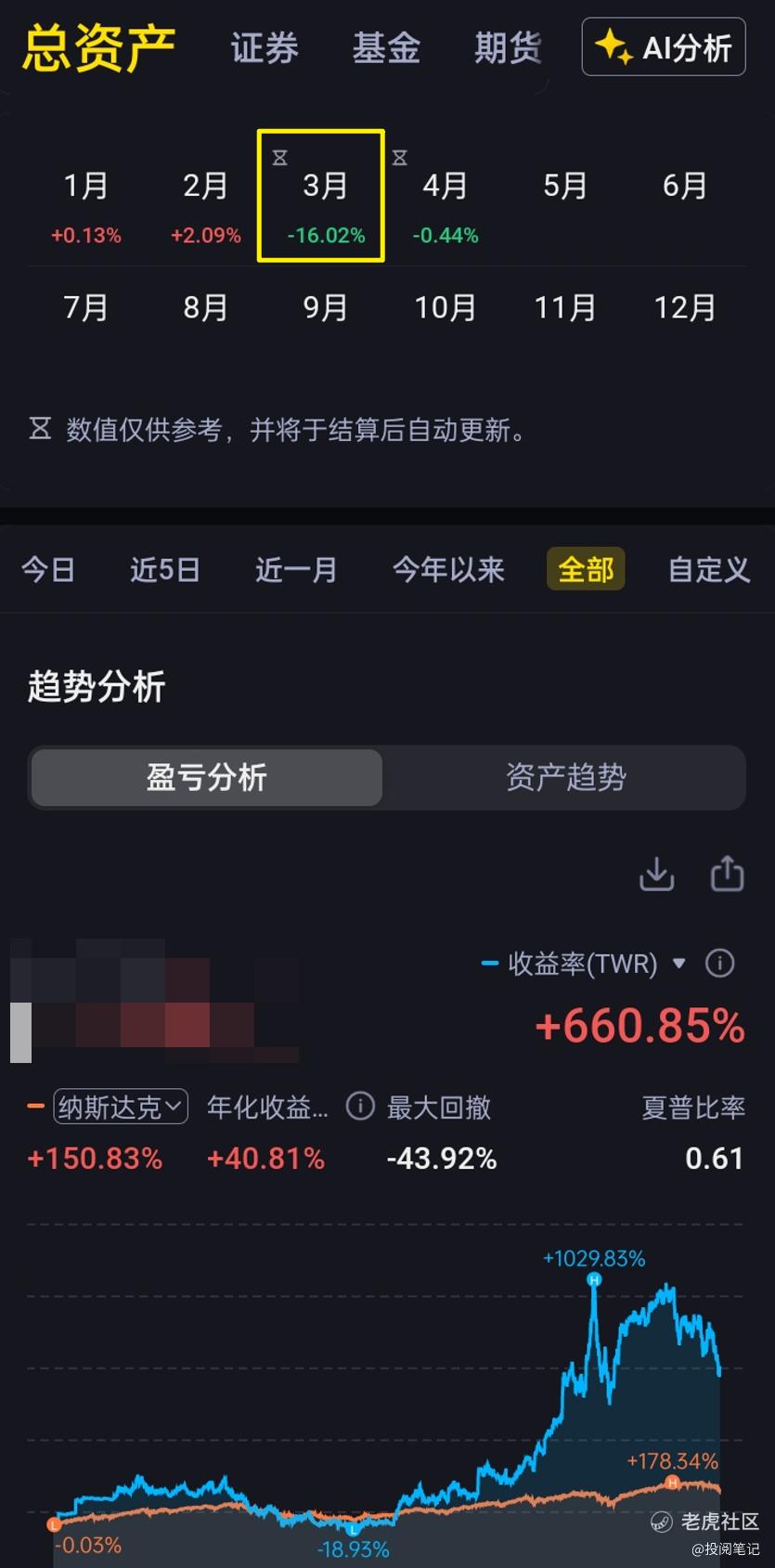 如上图所示,目前账户总收益来到了+660.85%,收益率相比大幅下降,上次是+822.13%,这是总的账户收益率,同时可以看到3月账户-16.02%,简单点说就是亏麻了。