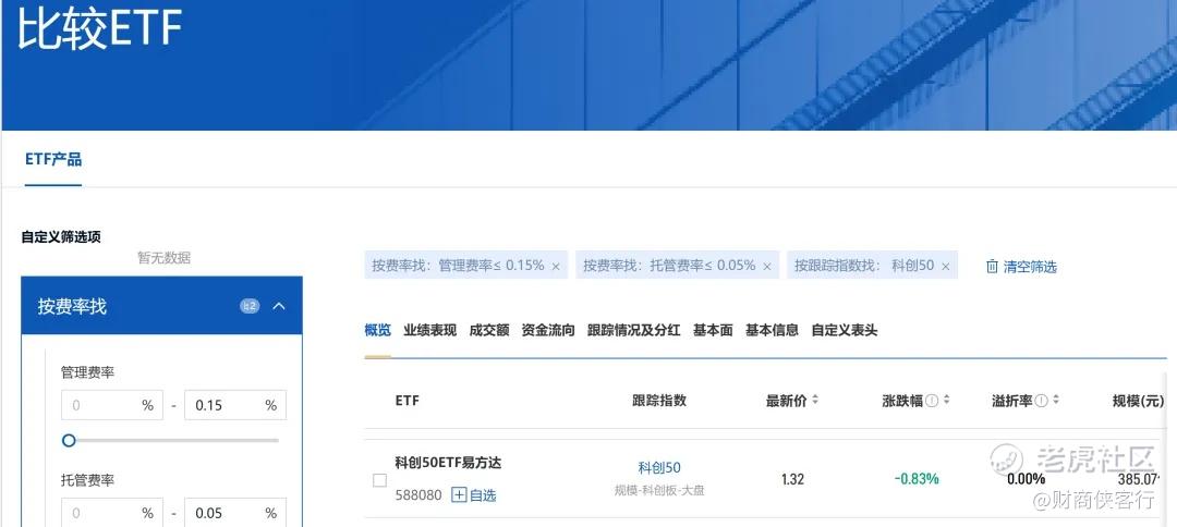 以科创50为例,想要找到相应的ETF,同时是市场上“费率最低”的,现在在指数直通车的网页上就能够轻松实现。
