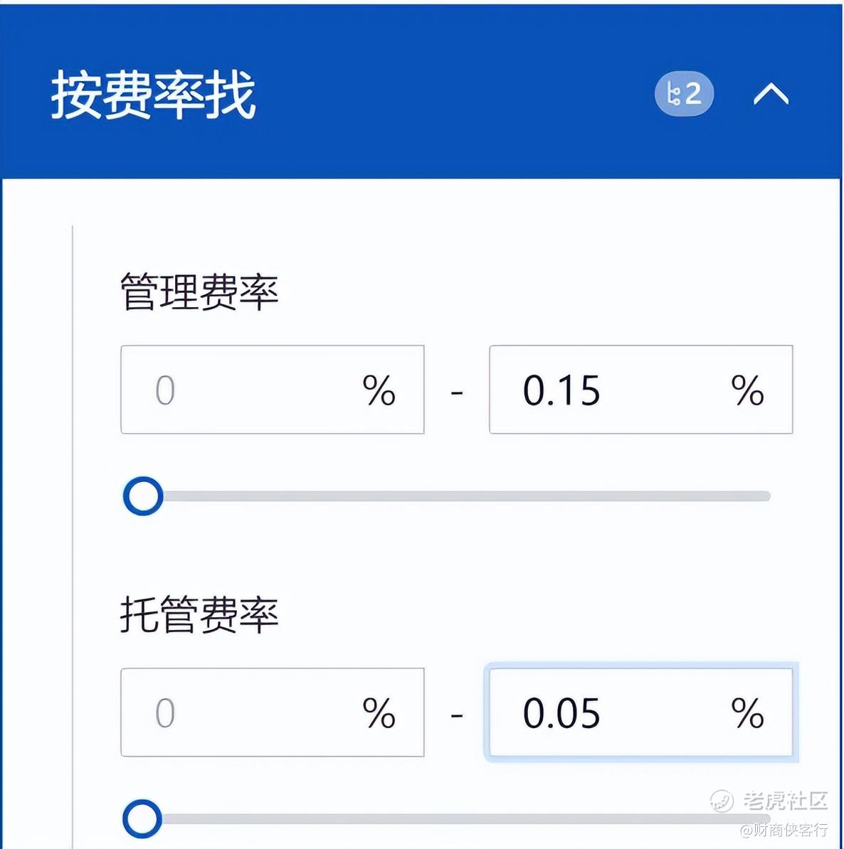 第三步:拉到“按费率找”,管理费率设为0-0.15%,托管费率设为0-0.01%