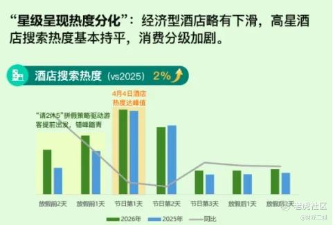 其他平台的数据也在证明着将要到来的这个小长假的热度。飞猪发布的《2026清明假期出游风向标》显示国内景区门票的预订张数同比增长了超70%;而携程的一份报告则通过酒店搜索热度展示出旅游消费逐渐分层的趋势。