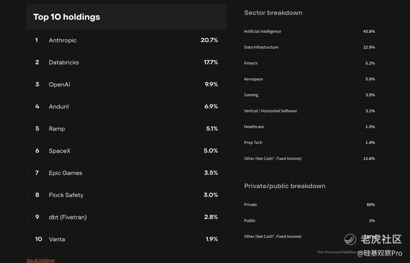 其中,私募资产组成里绝大部分都是最顶级的AI资产,比如Anthropic占了20.7%,OpenAI占了9.9%,再加上Databricks的17.7%,基本就是把当下最贵、最难买到的那一批AI资产,打包在了一起。
