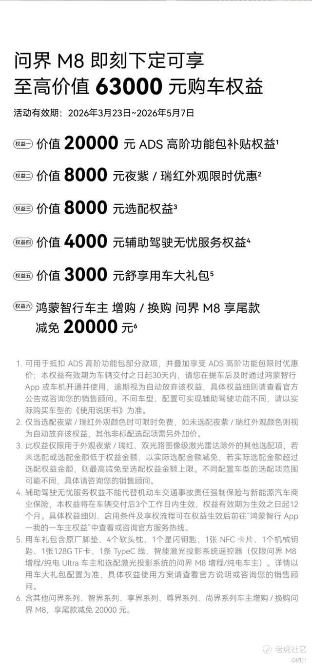 恰逢春日赏游好时节,问界M8以硬核实力承载春日的万千向往,5月7日前下定还可享至高价值63000元的限时购车权益,包括价值20000元ADS高阶功能包补贴权益、价值8000元夜紫/瑞红外观限时优惠、价值8000元选配权益、价值4000元辅助驾驶无忧服务权益,以及价值3000元舒享用车大礼包,鸿蒙智行车主增购或换购问界M8还可享尾款减免20000元。