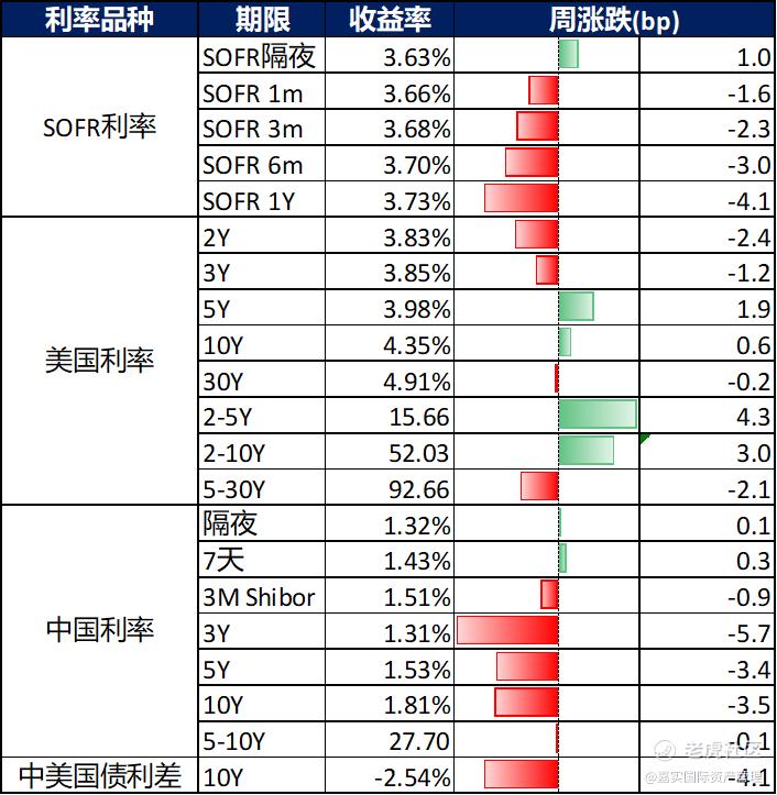 上周一年内SOFR曲线涨跌不一;美债收益率2年期下行2.4bps,10年期上行0.6bps;中国利率方面,3年期国债收益率下行5.7bps,10年期国债收益率下行3.5bps。中美10年期利差倒挂幅度为254bps。