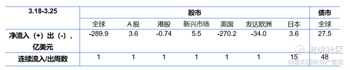 根据EPFR数据,3月18日 – 3月25日的一周内,全球股市资金转为净流出,债市连续第48周净流入(上周净流入27.5亿美元)。具体来看,A股转为净流入(上周净流入3.6亿美元);港股上周转为净流出(上周净流出0.74亿美元);新兴市场转为净流入(上周净流入5.5亿美元);美股转为净流出(上周净流出270.2亿美元);发达欧洲股市转为净流出(上周净流出34.0亿美元);日本股市连续第15周净流入(上周净流入3.6亿美元)。