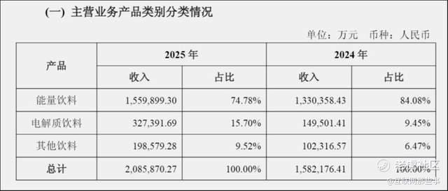 拆解东鹏饮料财报,能量饮料对总营收的贡献占比持续降低,已从2024年的84.08%降至2025年的74.78%,与此同时,电解质饮料却由2024年的9.45%大涨至2025年的 15.70%,与其他饮料加一块,已超过25%的比例,这直观说明了东鹏的第二增长曲线已然“跑通”。