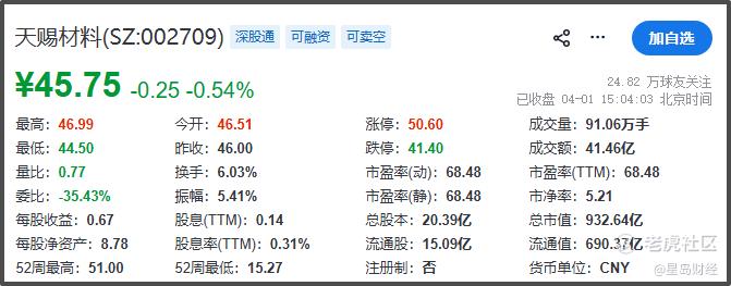 4月1日,天赐材料A股收盘报45.75元/股,微跌0.54%,总市值932.64亿元。