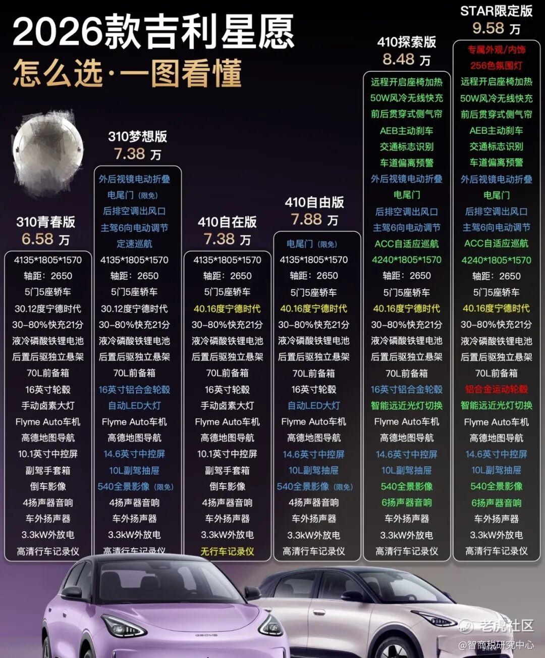 比如,吉利星愿的6.58万元版本,售价与零跑A10低配一样,但续航仅有310公里,比零跑少了近100公里。