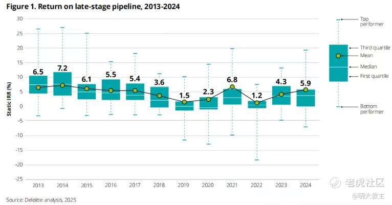 过去十年全球药企投入数千亿美元,换来百余款创新药获批,临床成功率不足10%。据德勤统计,2013至2024年药企创新研发IRR(内部收益率)介于1.2%至7.2%之间,IRR中枢隐有下行趋势。换句话说,制药大厂虽然能用一两条管线赚得盆满钵满,但是这门生意的创新回报率,已经低到可以让股东焦虑、让管理层失眠。