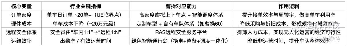 顺着这个模型再回头看曹操,无论是定制车,还是绿色智能通行岛、RAS远程安全平台,本质上都在重构Robotaxi的成本结构表,把最影响出勤率和成本的环节(补能、维护、调度、安全)做自动化与标准化,从而提升有效运营时间,压低边际成本。
