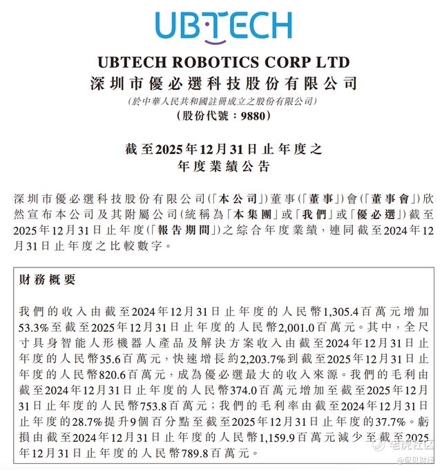3月31日,港股头部机器人企业优必选 $优必选(09880)$ 发布2025年全年业绩报告。财报显示,2025年优必选实现收入20.01亿元,同比增长53.3%;毛利为7.54亿元,同比增长101.6%;净亏损7.898亿元;归母净亏损7.03亿元,亏损幅度有所收窄。