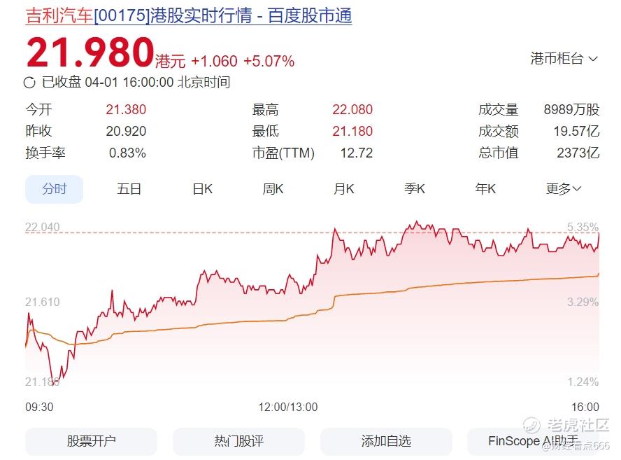 2026年4月1日,吉利汽车盘中表现亮眼,股价报21.90港元,涨幅超5%。盘中吉利汽车一度突破22港元,总市值直逼2400亿港元,走势持续强势。