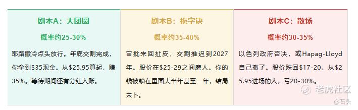 今天的ZIM股价$25.95,距离收购价$35还有26%的鸿沟。这道鸿沟的宽度,就是市场对耶路撒冷说"不"的恐惧。华尔街用真金白银给出的判断是:这笔交易成功的概率,大约只有四到五成。