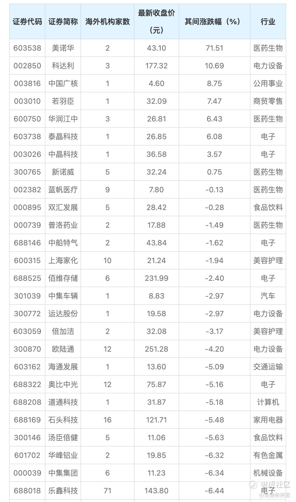 海外机构调研榜单中,乐鑫科技参与调研的海外机构达到71家,最受关注;其次是三花智控,参与调研的海外机构共有51家。