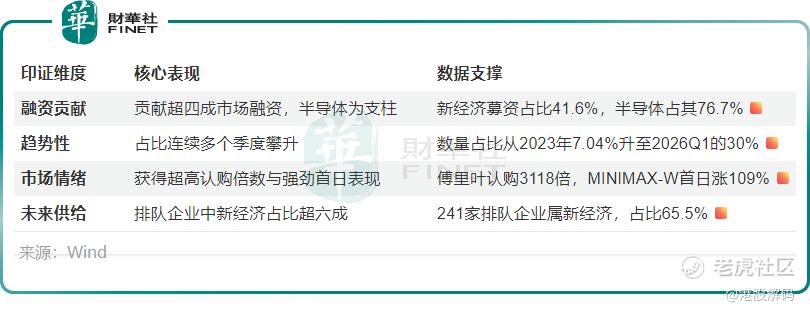 纵向对比更能看出趋势:新经济企业在港股IPO市场中的数量占比,已从2023年全年的7.04%显著攀升至2026年一季度的30.0%;而融资额占比也从2025年四季度的37.96%进一步提升至41.6%,呈现出稳步上升的态势。