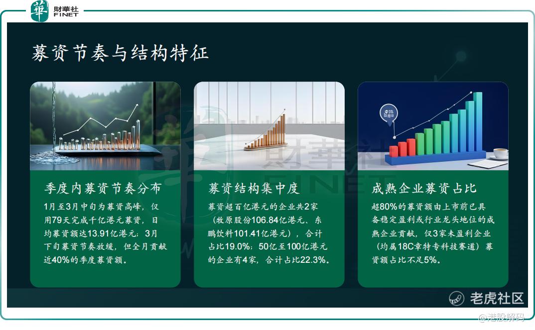 值得注意的是,本季度并未出现类似2025年那种超大型IPO项目,仅有 $牧原股份(02714)$ 和 $东鹏饮料(09980)$ 的融资额勉强破百亿。但即便如此,总募资额依然远超去年同期,显示出市场发行节奏的显著提速。