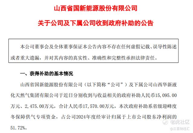 公告显示,本次政府补助分为两笔,其中国新能源收到1.51亿元,下属子公司山西华新液化天然气集团有限公司收到2475万元,资金性质为省级迎峰度冬保障供气专项资金,属于与收益相关的政府补助。