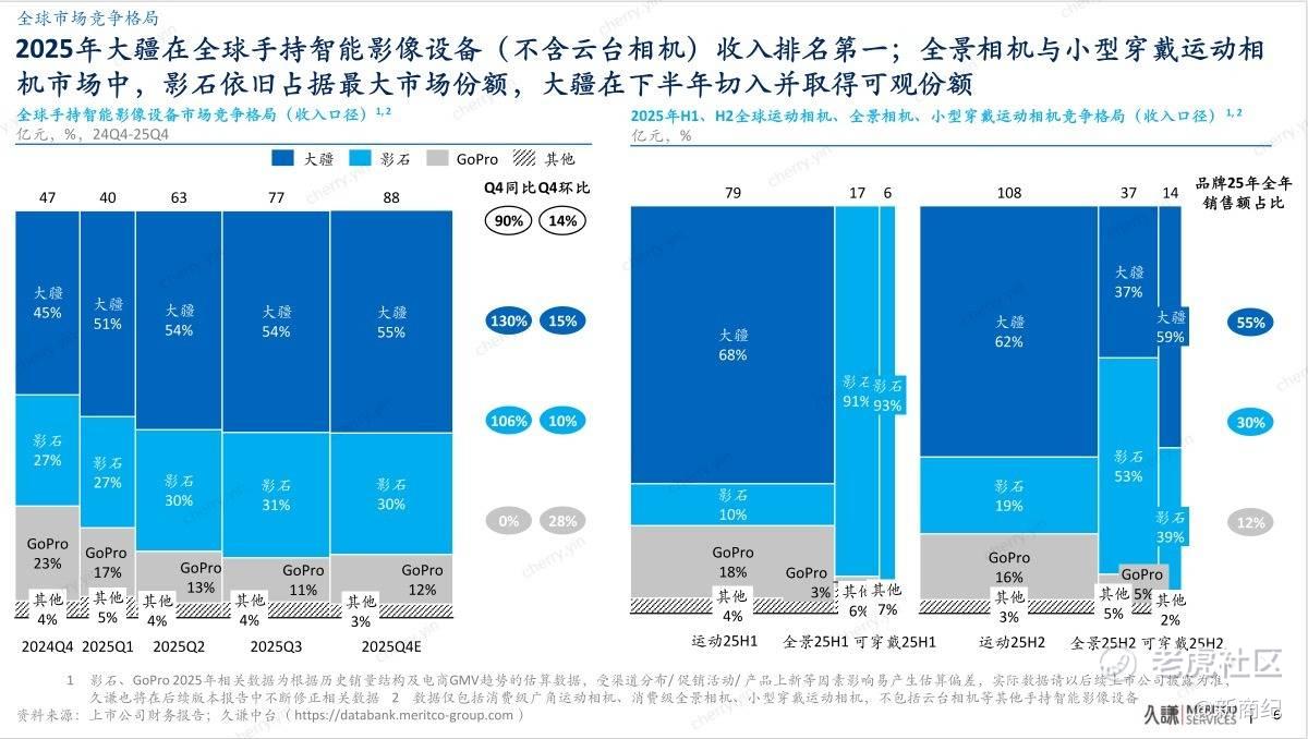久谦咨询最新发布的《2025年手持智能影像行业研究报告》显示,大疆凭借全年55%的全球市场份额,位居手持智能影像设备收入排名第一,这一数字是第二名影石30%的近两倍,而GoPro以12%的份额位列第三。
