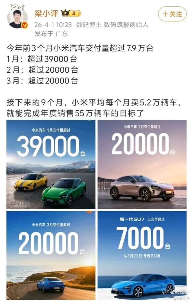 根据博主“梁小评”统计,一季度,小米汽车累计交付超7.9万辆。要完成全年目标,剩下的9个月月均交付量需达到约5.2万辆。