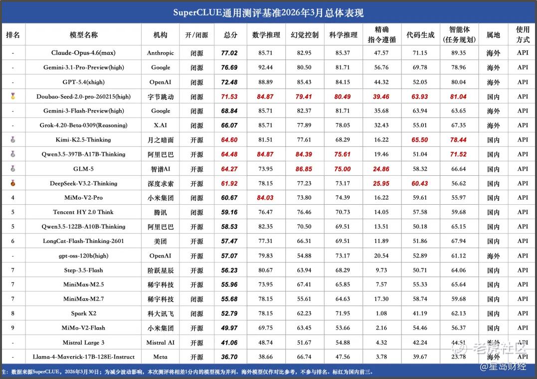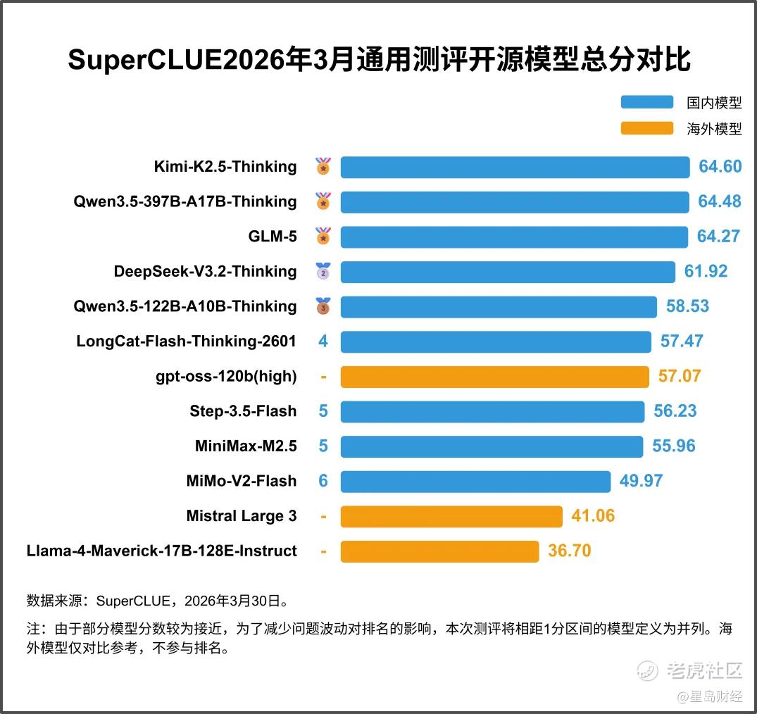 Super CLUE的3月最新测评中,开源榜单前列均为国内模型。其中,Kimi-K2.5-Thinking(64.60),Qwen3.5-397B-A17B-Thinking(64.48)与智谱GLM-5(64.27)并列开源第一,领先海外开源模型gpt-oss-120b(high)(57.07)超过7分,优势明显。盘古并未进入前列。