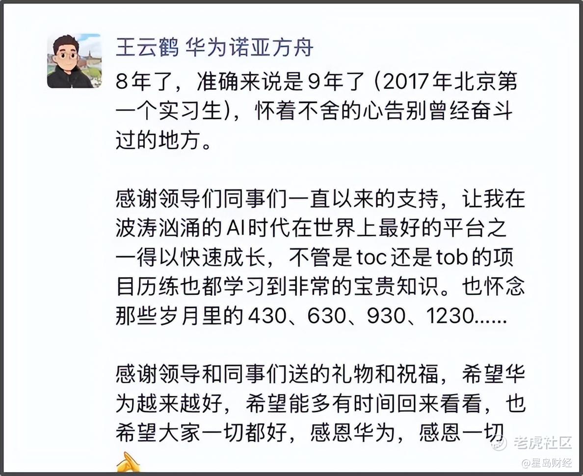 3月28日,王云鹤在朋友圈发文告别,正式官宣从**离职。“8年了,准确来说是9年了(2017年北京第一个实习生),怀着不舍的心告别曾经奋斗过的地方。感谢领导们同事们一直以来的支持,让我在波涛汹涌的AI时代在世界上最好的平台之一得以快速成长。”