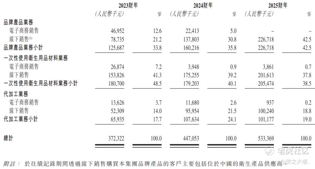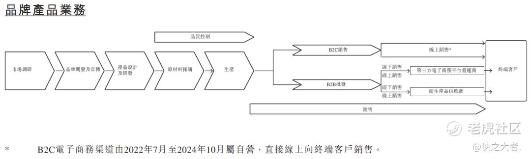 在公司的品牌产品业务下,公司主要在中国境内以多个自有品牌进行一次性使用卫生用品的研发、制造及销售。在往绩记录期间,公司的产品主要通过中国境内的B2C电子商务平台(包括抖音、快手及拼多多)以及超市和婴儿护理店等线下零售渠道销售给企业客户,而国际B2B平台仅贡献了微薄的收益。