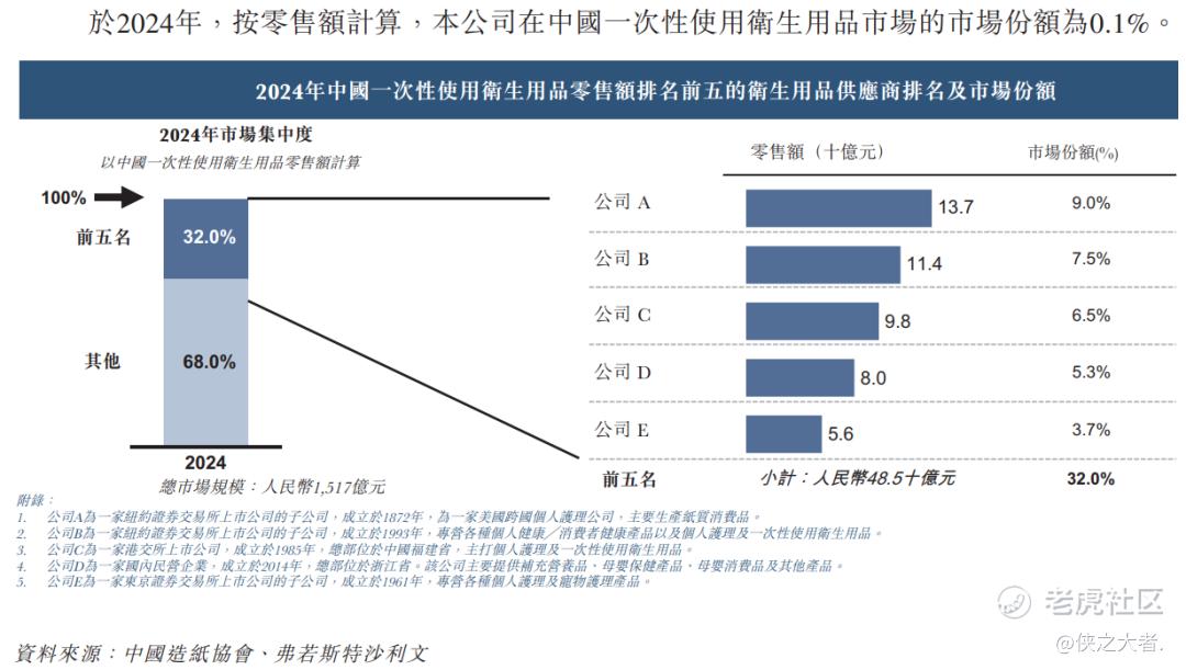 中国一次性使用卫生用品市场相对集中,于2024年,按零售额计算,前五大一次性使用卫生用品供应商合计占市场份额32.0%。于2024年,按零售额计算,公司在中国一次性使用卫生用品市场的市场份额为0.1%。