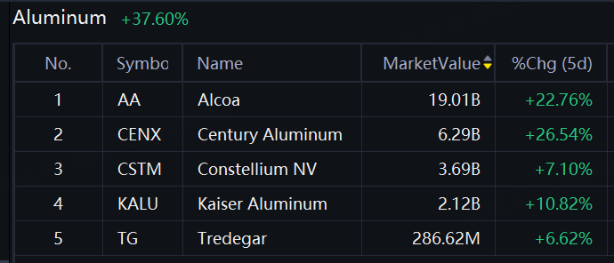 年内涨幅达到37.6%,最好的个股是 $美国铝业(AA)$ , $世纪铝业(CENX)$ , $Constellium N.V.(CSTM)$ , $凯撒铝业(KALU)$ , $特里迪加(TG)$