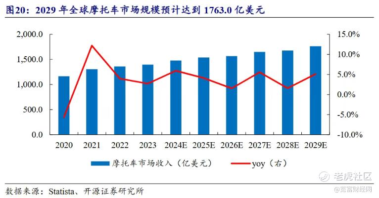 近年来,全球摩托车销量稳步提升。根据Statista数据,2024年全球摩托车销量约为5680万台,同比增长4%;预计2029年全球摩托车销量将达6280万台。市场空间方面,2024年全球摩托车市场规模为1479亿美元,2029年预计达到1763亿美元,2020—2029年期间复合增长率为4.7%。