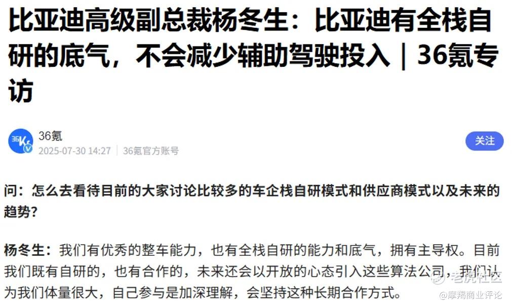 在余凯语出惊人引起市场巨大震动的几个月后,比亚迪高级副总裁、汽车新技术研究院院长杨冬生在接受36氪等媒体采访时表示:我们有优秀的整车能力,也有全栈自研的能力和底气,拥有主导权。杨冬生这番言论,似乎是对外界质疑予以回应。