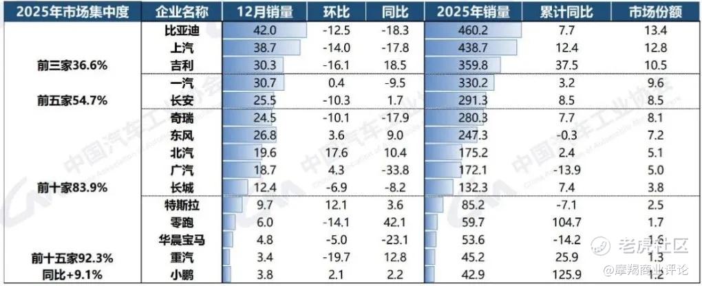 在国内汽车市场,比亚迪和吉利有着庞大的受众群体。根据中国汽车工业协会,2025年比亚迪和吉利的汽车销量分别为460.2万辆和359.8万辆,分别排在第一和第三,加起来的市场份额接近24%。