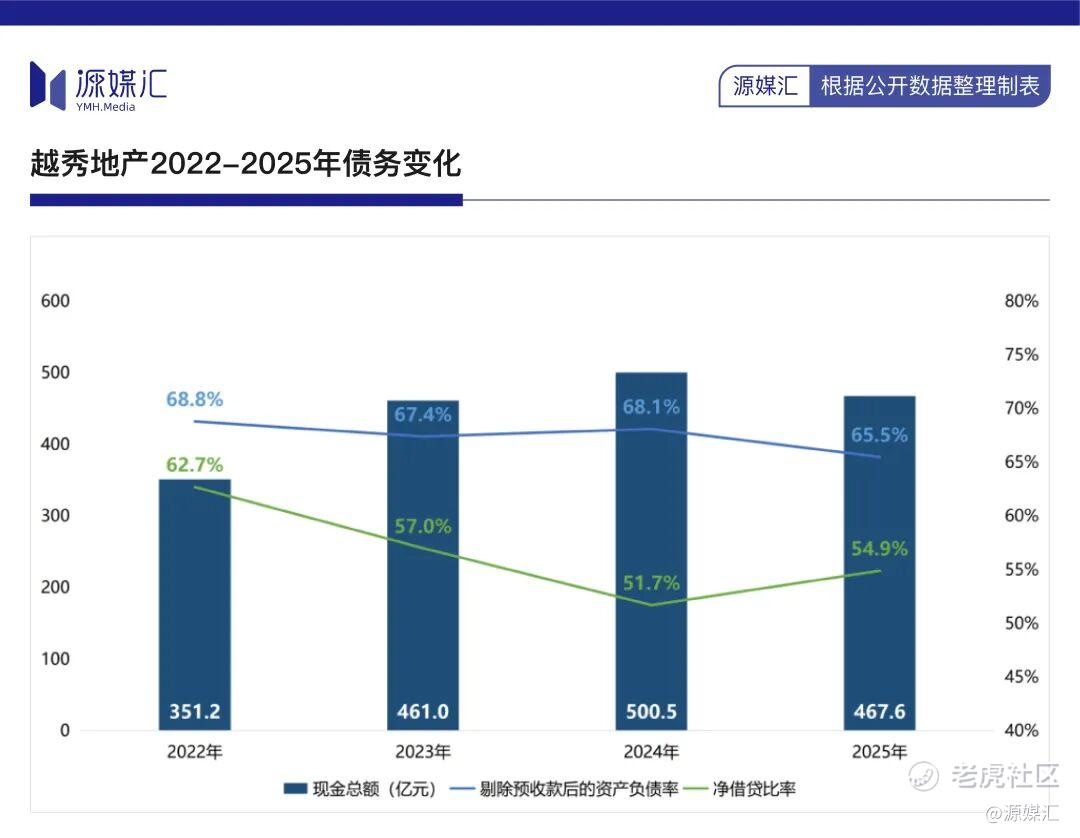 2025年,越秀地产在增厚安全垫,整体债务有所沉降,期末剔除预收款后的资产负债率为65.5%,净借贷比率为54.9%,持有现金467.6亿元,现金短债比为1.7倍,加权平均借贷成本继续下降,减少44个基点至3.05%。