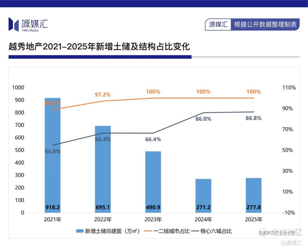 2025年末,越秀地产总土储为1855万㎡,其中,一二线城市占比达94.4%,核心六城可售货值占比约75%。同时,年内新增25宗土地,新增土储面积约278万㎡,整体投资溢价率约9.3%。