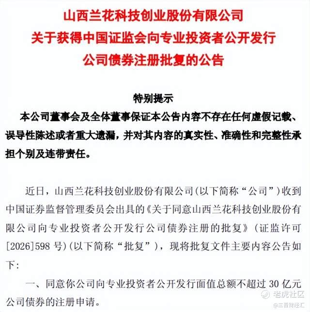 4月1日,山西A股上市公司兰花科创(600123.SH)发布公告称,公司收到中国证监会批复,获准向专业投资者公开发行面值总额不超过30亿元的公司债券。