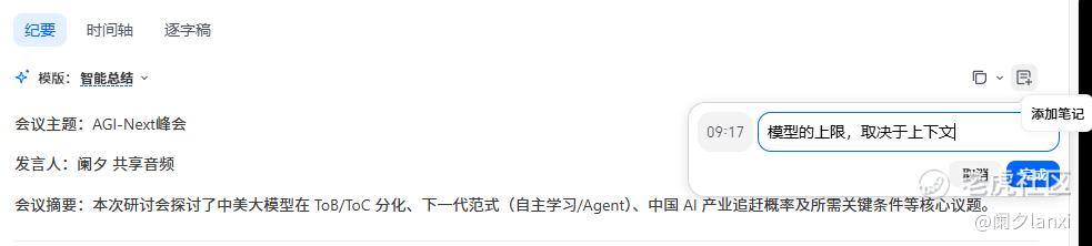 用户可以在纪要中的任意位置插入批注——突发灵感、主观判断、纠错直觉——这些笔记会跟会议内容长在一起,让会议资产随着人类的思考持续生长。