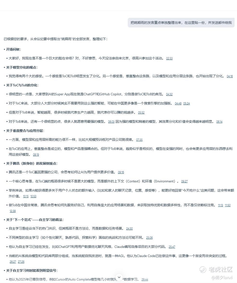 更加个性化的,是你能直接根据会议原文追问元宝,让它直接输出最符合心意的会议内容,比如对某人的发言特别感兴趣,就可以通过元宝进行一键总结,甚至让它帮你生成一封跟进邮件。