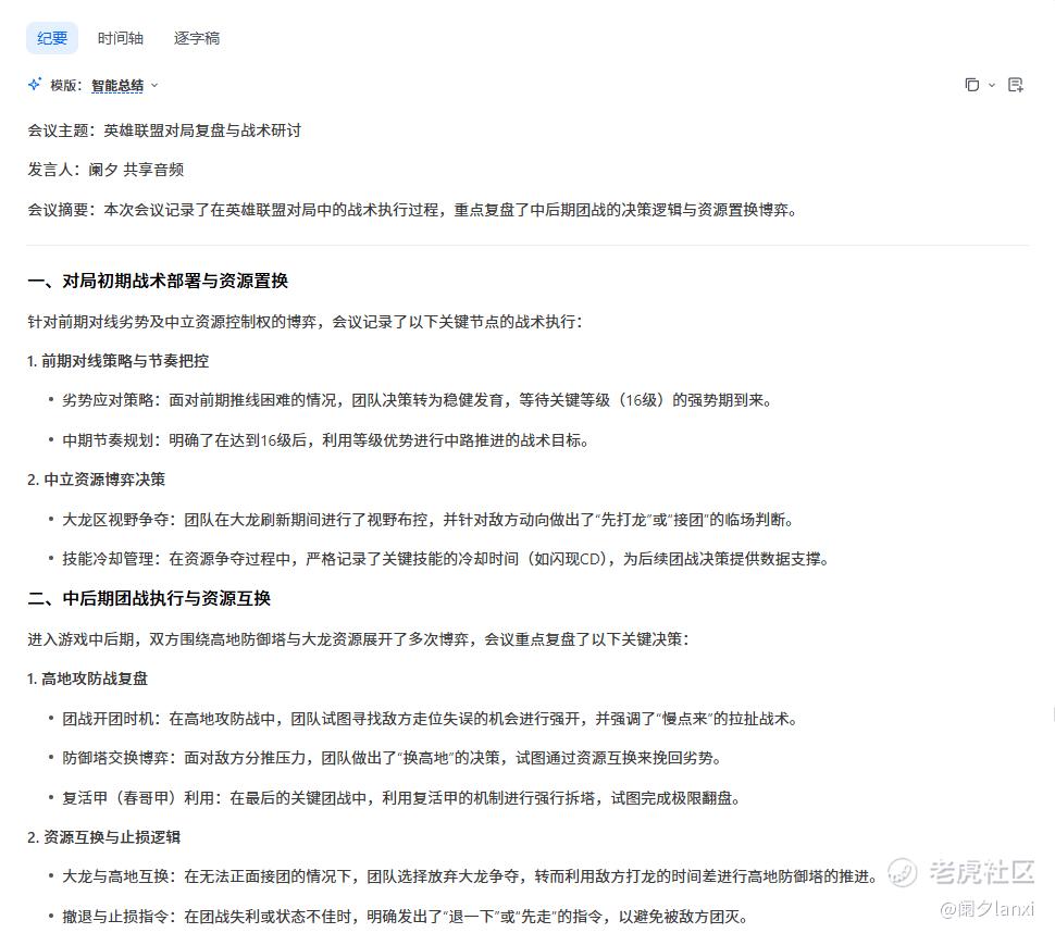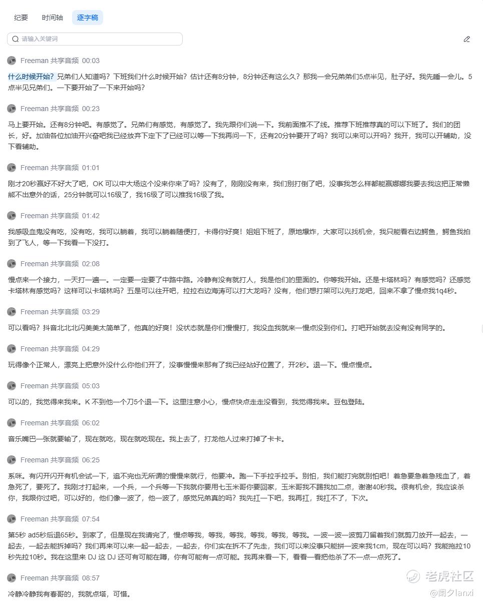 就我自己而言,也习惯了在跟朋友打游戏时顺带开着腾讯会议,几个小时下来,它会生成一份「会议纪要」,上面一本正经地记录着诸如「某人36次提出缺奶问题」「某人对队友操作提出批评性发言」这些细节,发到群里讨论,节目效果拉满。