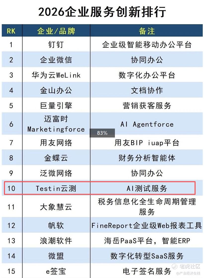 近日,由中国科学院主管的权威媒体《互联网周刊》正式公布了“2026企业服务创新排行”评选结果。Testin云测凭借在AI测试服务领域的深厚技术积淀与前沿创新成果,成功入选该榜单TOP 10。此次共同上榜的还有钉钉、企业微信、**云WeLink、金山办公、用友网络等国内科技领军企业。
