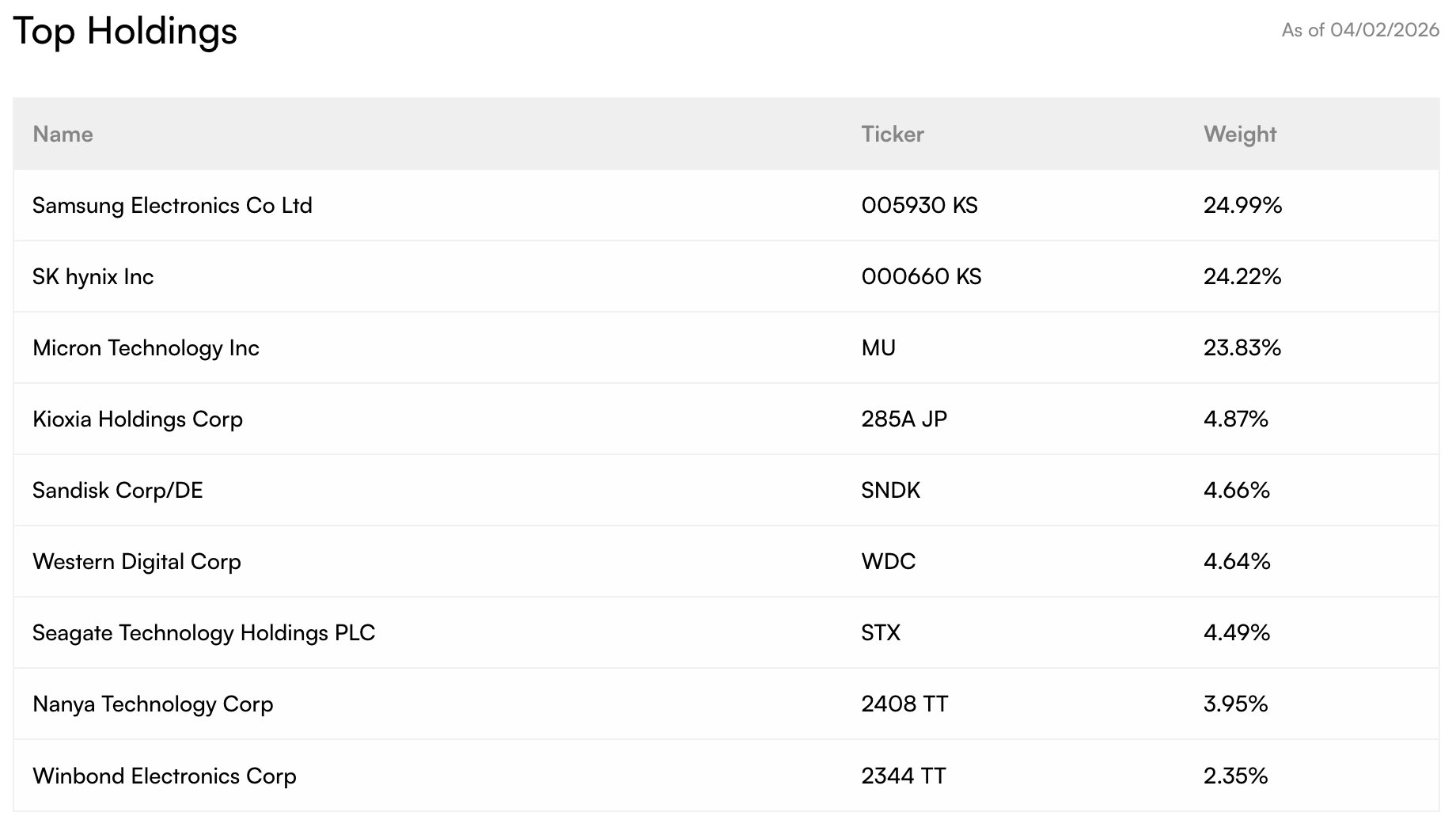 细看一下主要持仓,前三大持仓:Samsung Electronics-24.99%、SK hynix-24.22%、Micron Technology-23.83%,合计 ≈ 73% 权重,此外其他持仓包括Kioxia(NAND), $闪迪(SNDK)$ , $西部数据(WDC)$ , $希捷科技(STX)$ , $Nanya Technology Corp.(NNYAF)$ ,Winbond Electronics,单个权重基本在2%–5%。基本就是在押内存寡头。 $南方两倍做多三星电子(07747)$ $南方两倍做多海力士(07709)$ $美光科技(MU)$