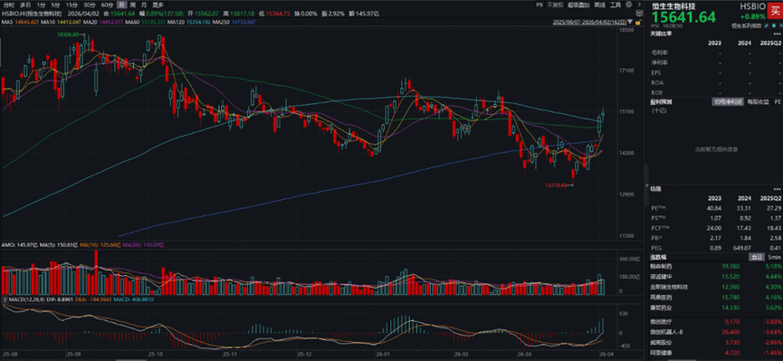 4月1日,恒生生物科技指数单日上涨6.78%,4月2日继续上涨0.89%,两日连涨,昨日收于15641点。