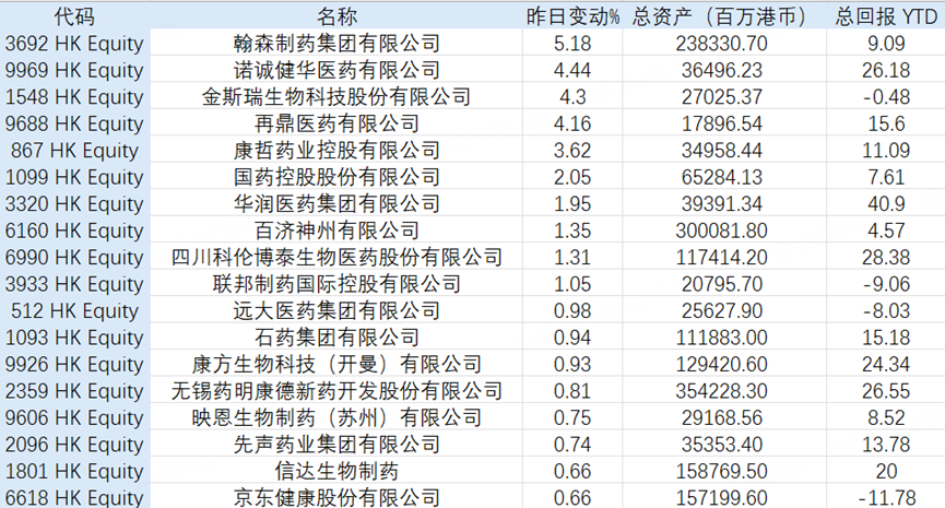 从ETF表现来看,跟踪医药与生物科技方向的基金同步走强。昨日, $华夏恒生生科(03069)$ 上涨0.58%, $南方恒生生科(03174)$ 上涨0.92%, $GX中国生科(02820)$ 上涨1.17%,整体呈现出与指数一致的上行节奏,资金在被动产品中的配置同样在增加。