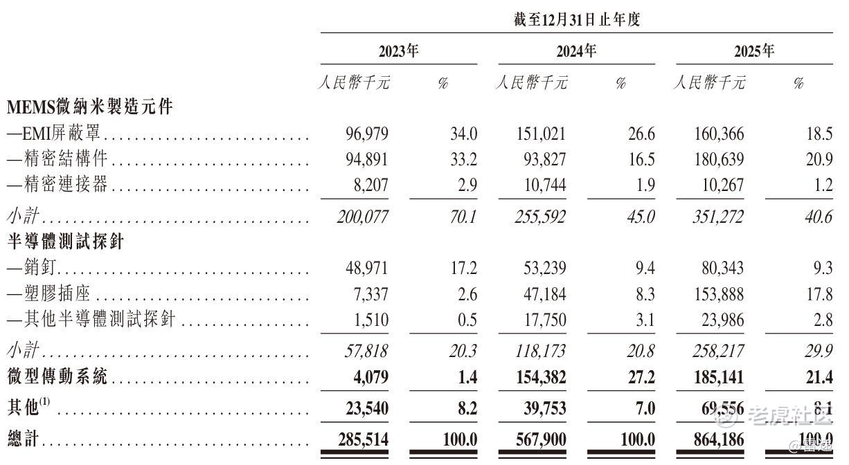 和林微纳2025年来自MEMS微纳米制造元件收入为3.51亿,占比为40.6%;来自半导体测试探针收入为2.58亿元,占比为29.9%,来自微型传动系统收入为1.85亿元,占比为21.4%。