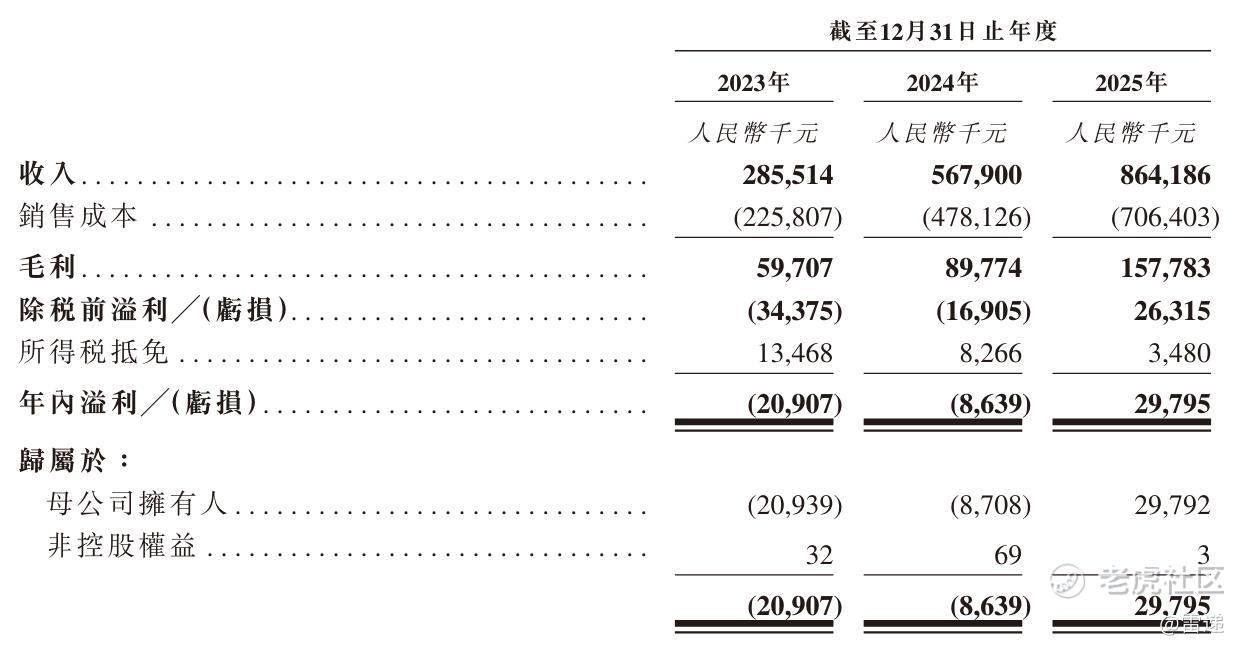 招股书显示,和林微纳2023年、2024年、2025年营收分别为2.86亿元、5.68亿元、8.64亿元;毛利分别为5971万元、8977万元、1.58亿元;期内利润分别为-2091万元、-864万元、2980万元。