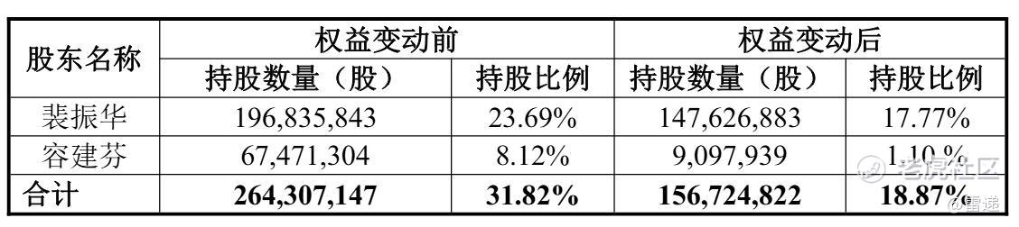裴振华、容建芬夫妻此次交易前,一共持股为31.82%,其中,裴振华持股为23.69%,容建芬持股为8.12%。
