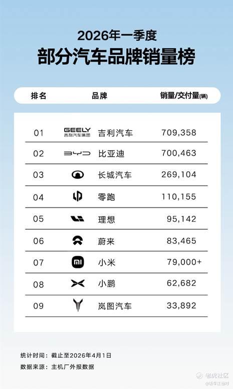 吉利汽车3月总销量为23.3万辆,2026年第一季度销量数据达到约71万辆!其中3月销量数据有亮点:高端品牌极氪3月销量同比暴增90%,旗舰车型极氪9X月销破万,成交均价突破50万元,连续多月稳居50万级市场前列,极氪8X预售48小时订单破3万;领克销量2.5万辆,今年一季度累计同比增长12%。3月出口8.2万辆同比增120%,覆盖东南亚、欧洲、南美等市场。