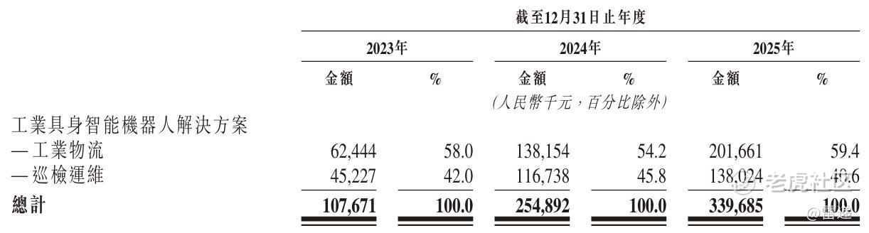 优艾智合收入分为工业物流和巡检运维,其中,2025年来自工业物流收入为2亿元,占比为59.4%;来自巡检运维收入为1.38亿元,占比为40.6%。