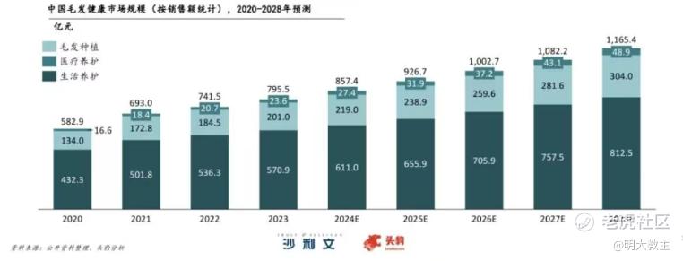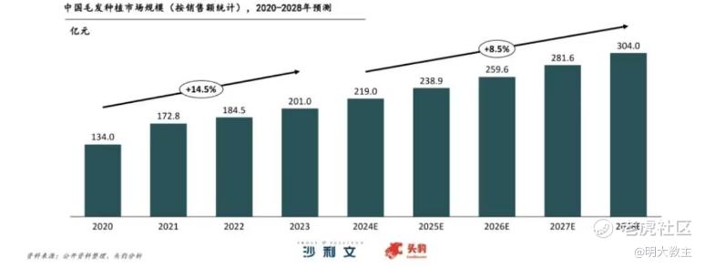弗若斯特沙利文发布的《2024年中国毛发健康服务行业研究》显示,2024-2028年我国植发市场规模将由210亿增至304亿,年化复合增速8.5%。